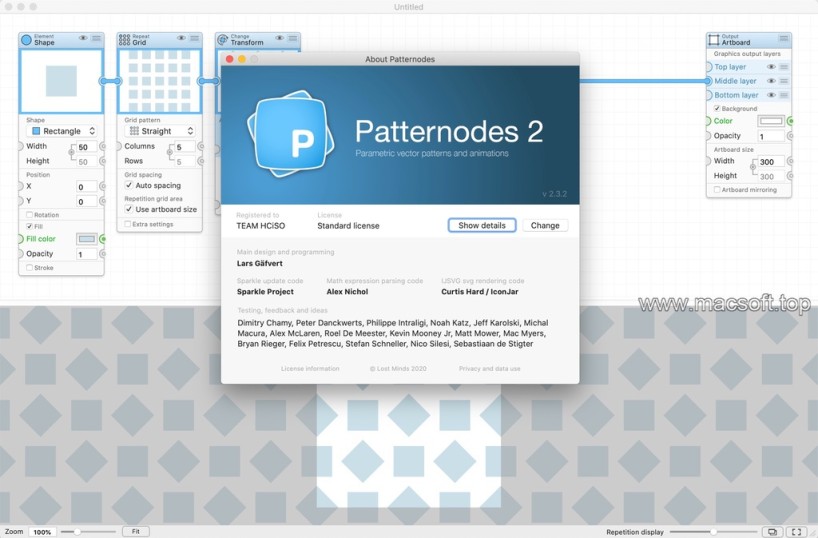 所产生的模式tile总是在底部预览视图中显示,在实时的情况下进行重复和更新,使您能够即时反馈最终的结果。来简化创建模式Patternodes还包含很多节点自动执行常见的单调乏味的任务,如重复元素的瓷砖边缘模式无缝,或者随机的不同方面(如颜色、位置、旋转等)元素的模式给它多一点的生活。最后,当您完成时,您可以简单地将模式tile复制到您所使用的任何插图或图形应用程序中,或者将其导出为矢量图形或位图图像文件。动画可以导出为GIF, QuickTime MOV或编号PNG或JPG文件。