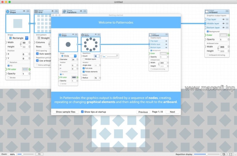 PatterNodes是一种基于重复的图形模式、动画、渐变或插图的工具。这是通过定义一系列步骤来完成的,这是一种描述模式的方法。每个模式元素或操作由一个称为节点的小面板表示,然后节点通过它们之间的连接连接起来。当节点可以自由组合和连接时,这将给您一个非常灵活和强大的接口。