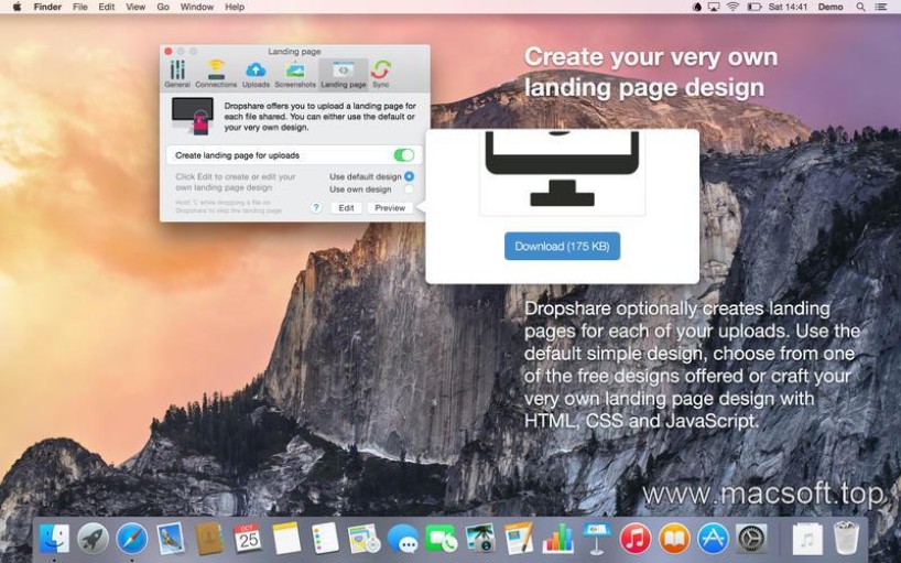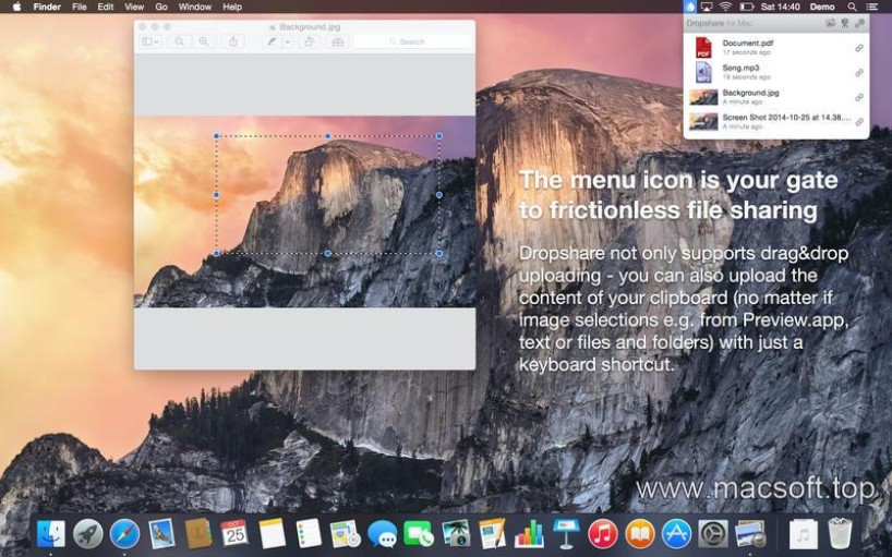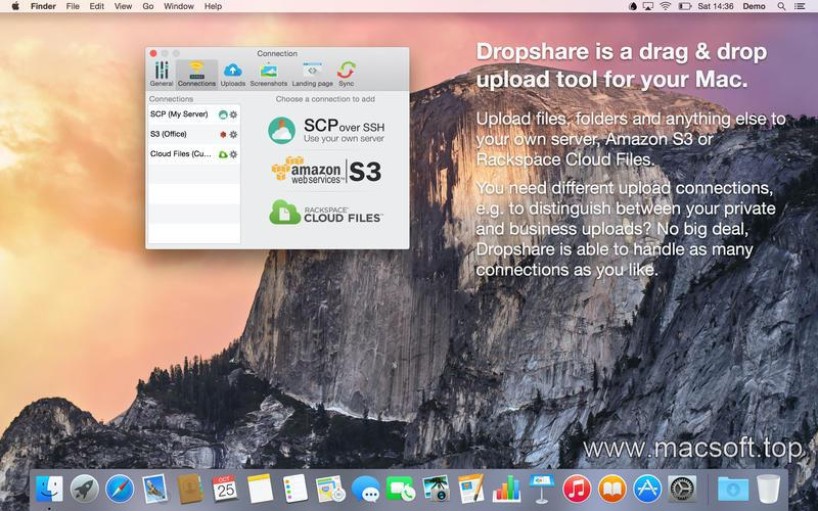 Dropshare 这款软件利用了SCP over SSH传输协议来将 Mac 本机的文件快速上传到自设的远程服务器,同时自动创建文件公共访问地址方便用户分享, Dropshare在此基础上还提供了自动上传本机屏幕截图,共享文件自动生成 URL 短地址, 本机删除服务器上传文件,从剪切板上传图片/文字,自动排队上传,上传文件历史列表,共享文件方面页面自定义等功能.